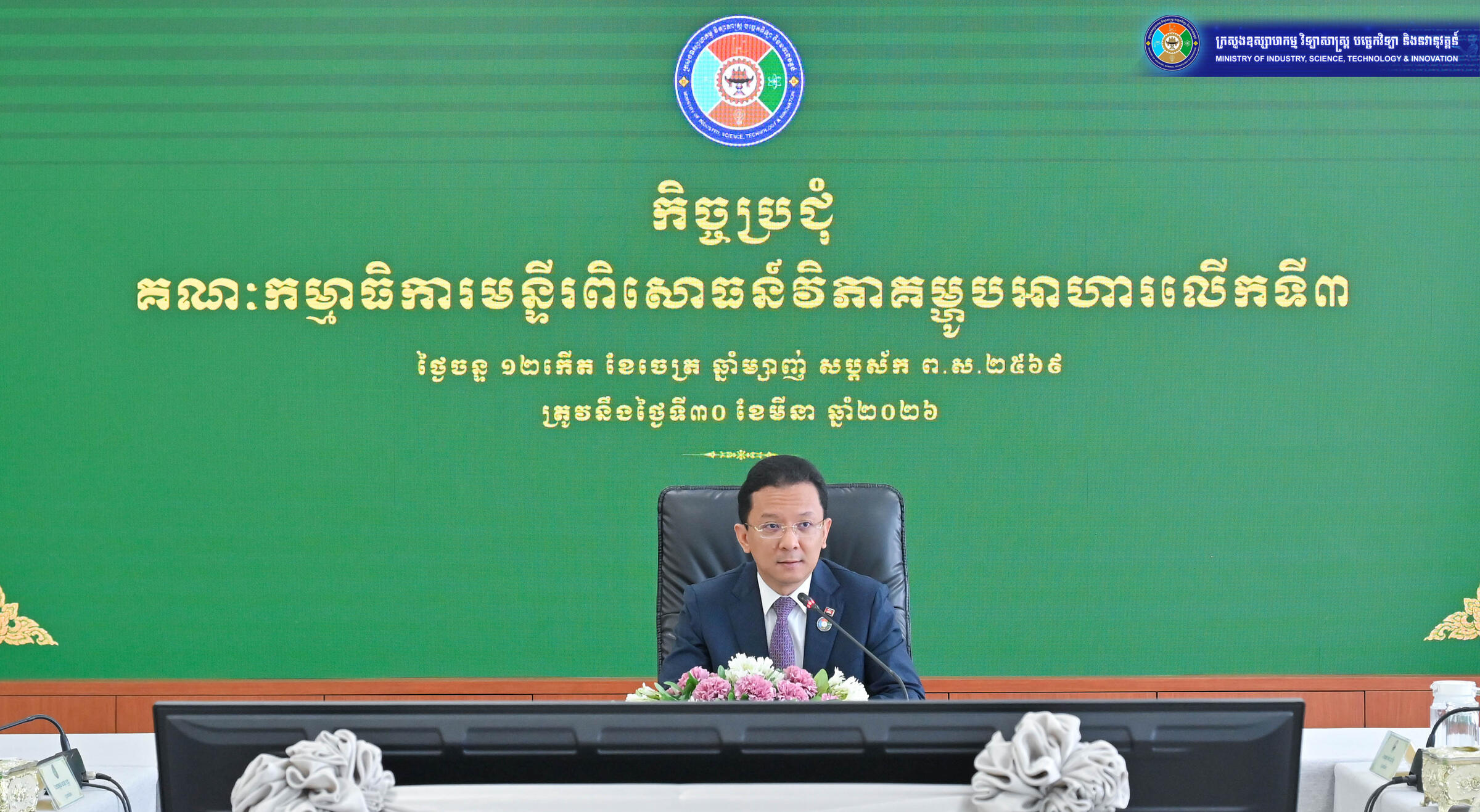 រាជធានីភ្នំពេញ ថ្ងៃទី៣០ ខែមីនា ឆ្នាំ២០២៦ — គណៈកម្មាធិការមន្ទីរពិសោធន៍វិភាគម្ហូបអាហារ បានបើកកិច្ចប្រជុំលើកទី៣ ក្រោមអធិបតីភាព ឯកឧត្តមរដ្ឋមន្ត្រី ហែម វណ្ណឌី ប្រធានគណៈកម្មាធិការ។ កិច្ចប្រជុំបានផ្តោតលើការអភិវឌ្ឍប្រព័ន្ធអេកូឡូស៊ីមន្ទីរពិសោធន៍វិភាគម្ហូបអាហាររបស់កម្ពុជា ដោយមានការចូលរួមពីតំណាងក្រសួងចំនួន៦ ដែលជាសមាជិកនៃគណៈកម្មាធិការនេះ។