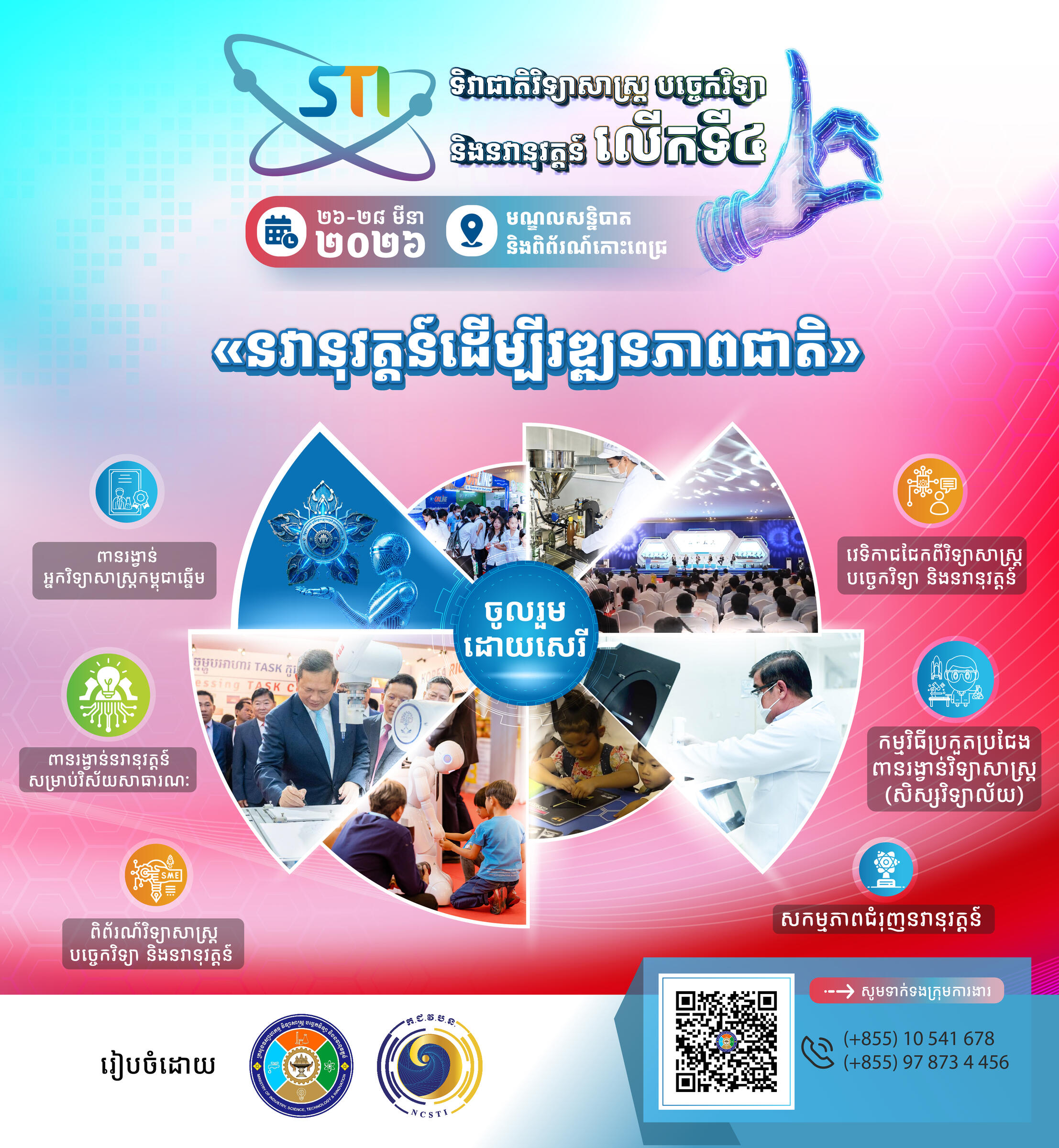 ក្រសួងឧស្សាហកម្ម វិទ្យាសាស្ត្រ បច្ចេកវិទ្យា និងនវានុវត្តន៍ នឹងរៀបចំទិវាជាតិវិទ្យាសាស្រ្ត បច្ចេកវិទ្យា និងនវានុវត្តន៍ លើកទី៤ ពីថ្ងៃទី២៦ ដល់ ២៨ ខែមីនា ឆ្នាំ២០២៦ នៅមណ្ឌលសន្និបាត និងពិព័រណ៍កោះពេជ្រ រាជធានីភ្នំពេញ។