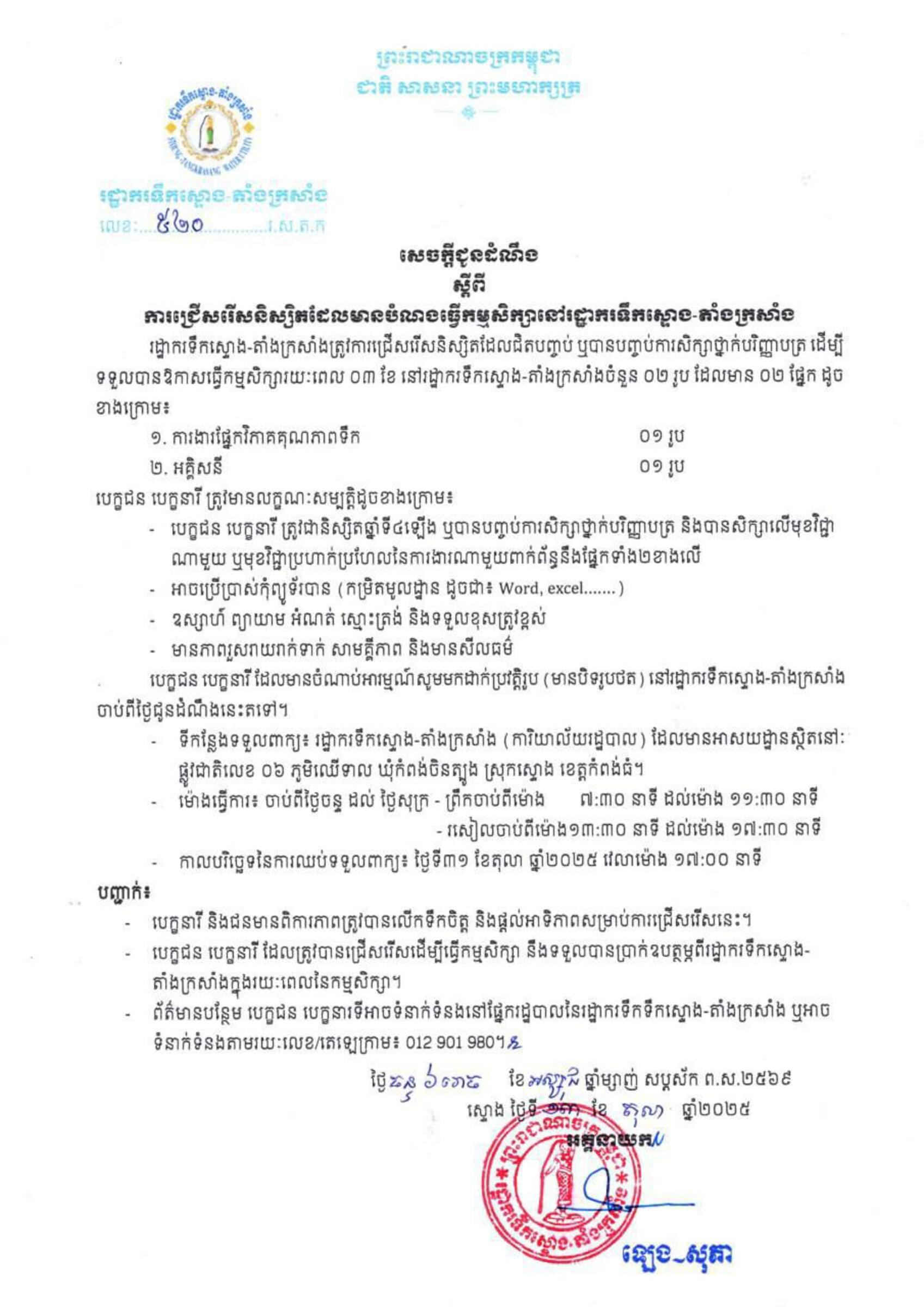 សេចក្តីជូនដំណឹង ស្តីពីការជ្រើសរើសនិស្សិតដែលមានបំណងធ្វើកម្មសិក្សា (Internship) រយៈពេល ៣ខែ នៅរដ្ឋាករទឹកស្ទោង-តាំងក្រសាំង (រ.ស.ត.ក) លើជំនាញ ១. ការងារផ្នែកវិភាគគុណភាពទឹក ២. អគ្គិសនី