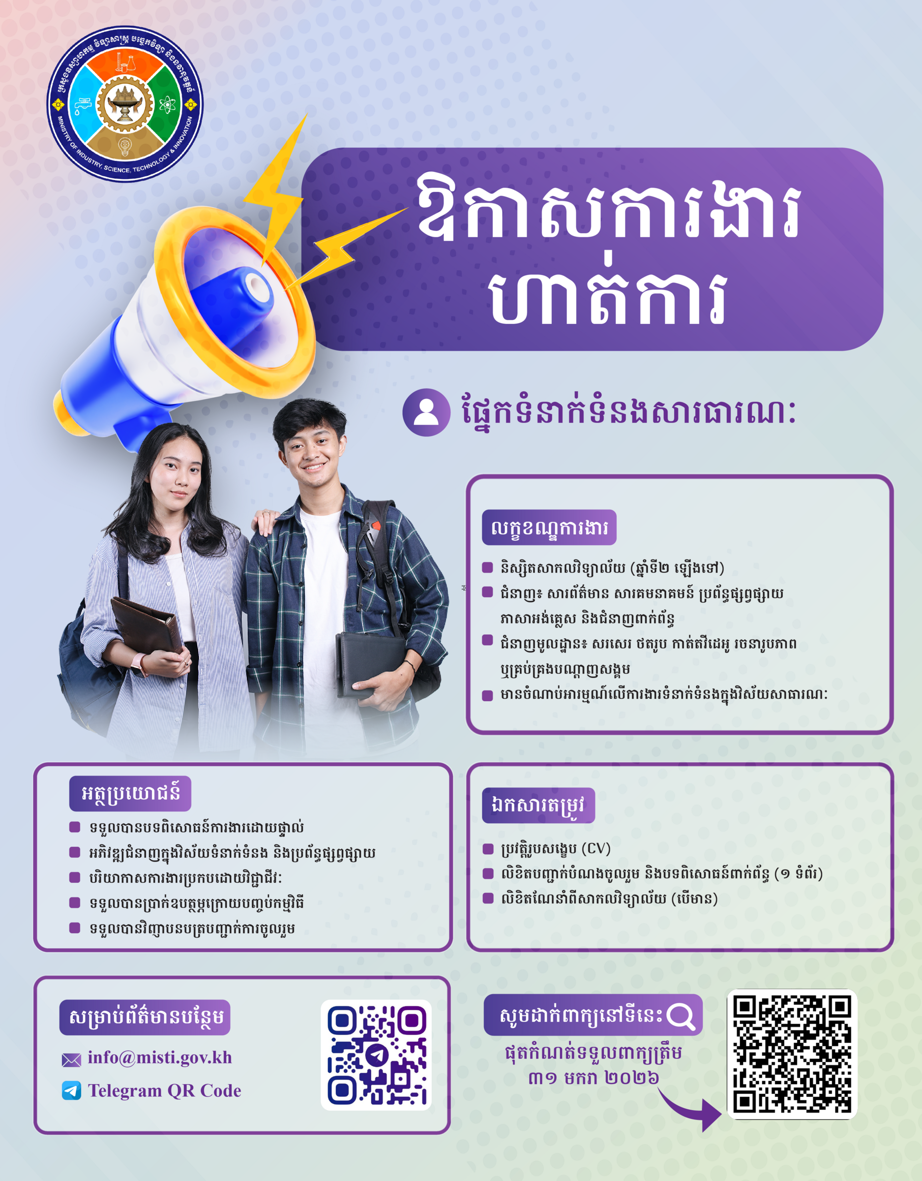 ក្រសួងឧស្សាហកម្ម វិទ្យាសាស្រ្ត បច្ចេកវិទ្យា និងនវានុវត្តន៍ សូមជូនដំណឹងដល់សិស្សនិស្សិតដែលមានបំណងចង់ហាត់ការផ្នែកទំនាក់ទំនងសាធារណៈ
