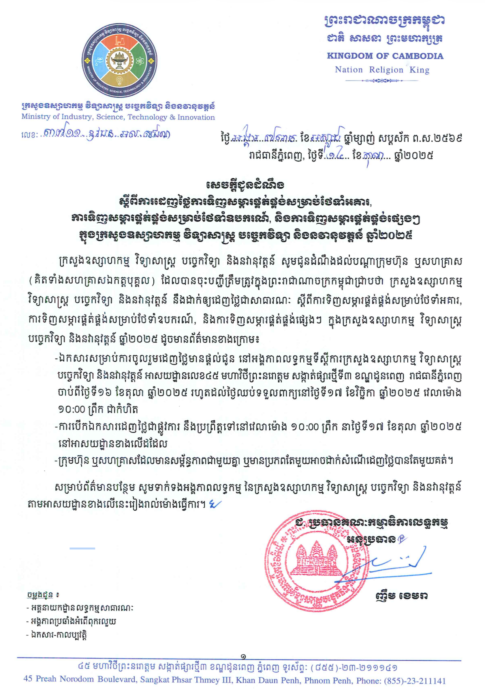 សេចក្តីជូនដំណឹងស្តីពីការដេញថ្លៃការទិញសម្ភារផ្គត់ផ្គង់សម្រាប់ថែទាំអគារ ការទិញសម្ភារផ្គត់ផ្គង់សម្រាប់ថែទាំឧបករណ៍ និងការទិញសម្ភារផ្គត់ផ្គង់ផ្សេងៗ ក្នុងក្រសួងឧស្សាហកម្ម វិទ្យាសាស្ត្រ បច្ចេកវិទ្យា និងនវានុវត្តន៍ ឆ្នាំ២០២៥